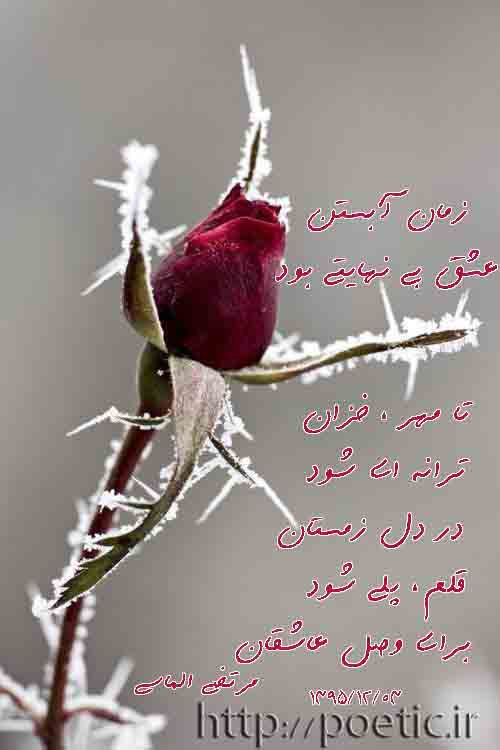 میلاد عشق زمان آبستن عشق بی نهایتی بود تا مهر ، خزان ترانه ای شود در دل زمستان قلم ، پلی شود برای وصل عاشقان # مرتضی الماسی # 27/02/2017 03/12/1395